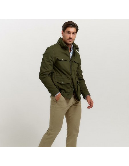 - Chaqueta tipo sahariana confeccionada con corte entallado en tejido 100% algodón.