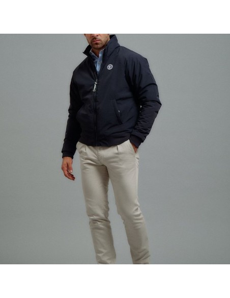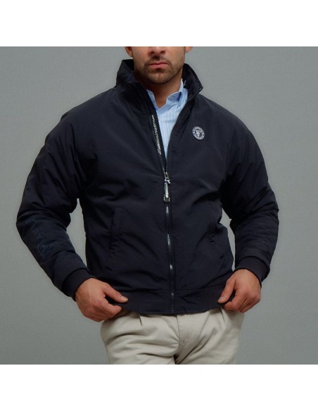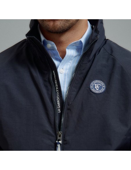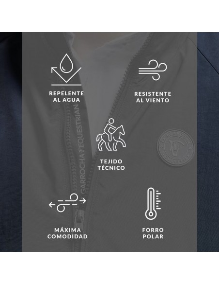 - Cuello alzado con cierre de cremallera frontal con tirador personalizado y bajo elástico.