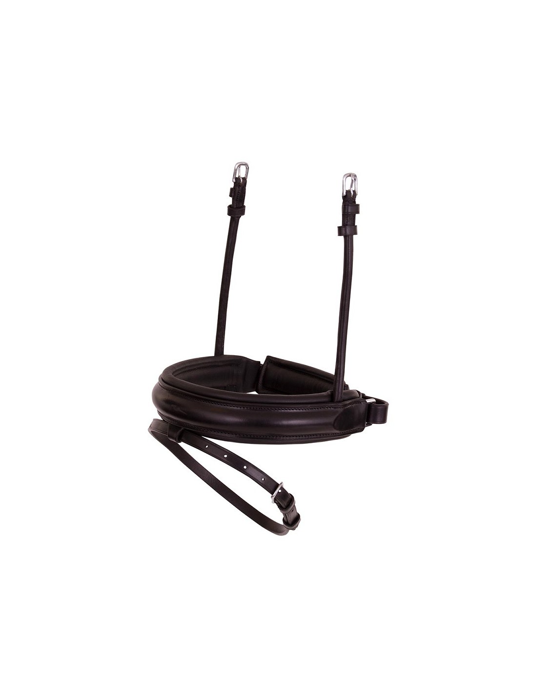 Esta muserola extra ancha (± 5 cm) con muserola de manivela y acolchado suave presenta un resalte redondo y una mentonera ancha con acolchado suave. Las carrilleras son de cuero enrollado. La muserola tiene un enganche para la muserola en forma de V y su hebilla cuenta con una solapa de protección adicional. Adecuada para bridas con muserola con correas que se fijan a la testera mediante una hebilla, como las bridas BR simétricas. Con herrajes plateados brillantes.