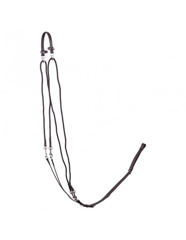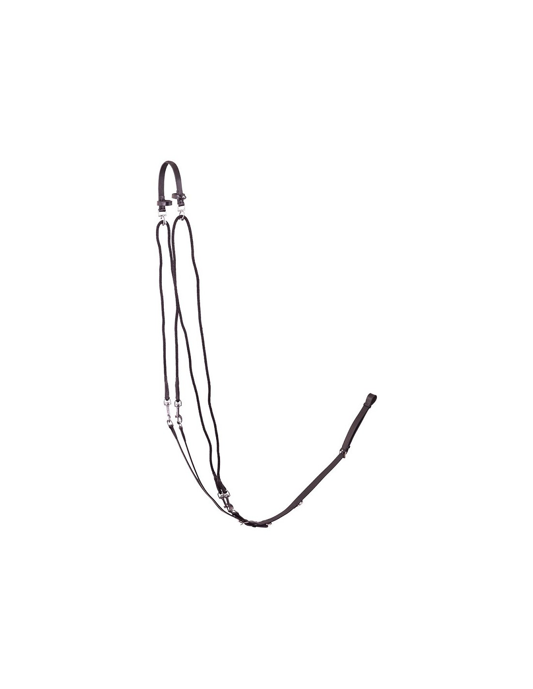 Gogue de cuero con correa ajustable para la cincha con cierre de hebillas y tres anillas en D: una en el extremo y dos en la parte del pecho para más opciones de ajuste. Gogue de cuero con correa ajustable para la cincha con cierre de hebillas y tres anillas en D: una en el extremo y dos en la parte del pecho para más opciones de ajuste. Los suaves cordones de nailon se sujetan con mosquetones y pasan por las anillas de amarre hasta las anillas (con hebillas de rodillo) de la testera de cuero, de vuelta a la parte del pecho del gogue, donde se unen a una de las tres anillas en D mediante un mosquetón. De esta manera, se forma un triángulo que evita que el caballo extienda demasiado el cuello.
