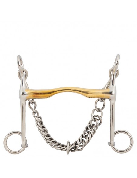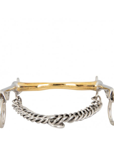 Bocado de Weymouth de alta calidad, con un puerto bajo que ofrece algo de alivio para la lengua y carrilleras fijas, está hecho de Cuprigan sólido con carrilleras de acero inoxidable. Cuprigan es una aleación que consta de 89% de cobre, 7% de aluminio, 3% de hierro y 1% de zinc. El proceso de oxidación del material le da un olor y un sabor agradables. El diseño anatómico del bocado sigue la forma de la boca del caballo, lo que permite una distribución suave y uniforme de la presión. El diseño, combinado con las propiedades únicas de Cuprigan, fomenta el proceso de masticación y la producción de saliva, lo que permite una conexión agradable con la boca sensible del caballo. El bocado aplica una presión fuerte en la boca. Grosor de la embocadura 12 mm, longitud de la caña 140 mm. Cadena de bordillo incluida.