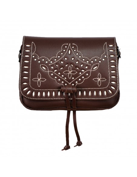 Bolsito rociero de piel vaqueta con tira para colgar en el hombro, con moña de adorno.