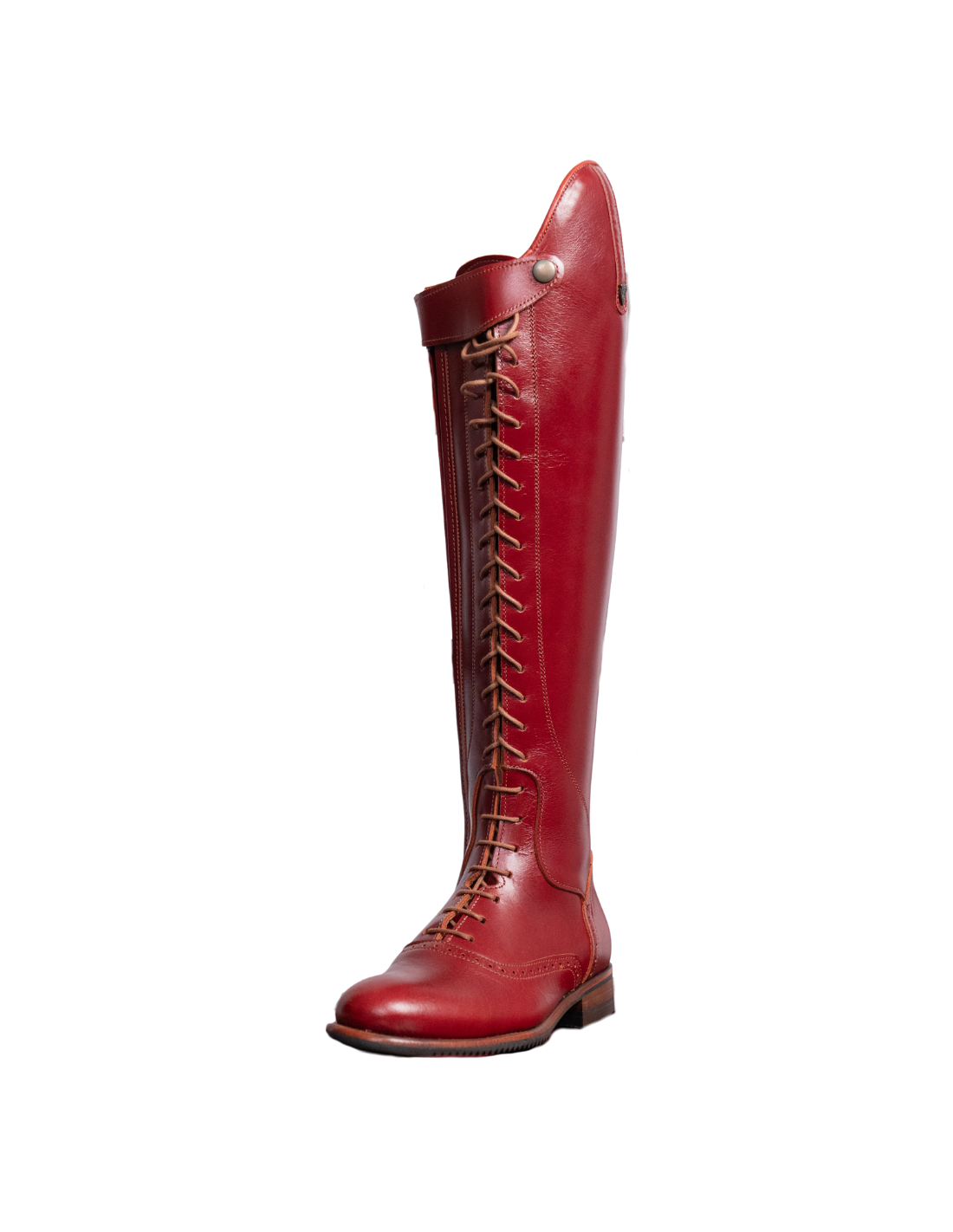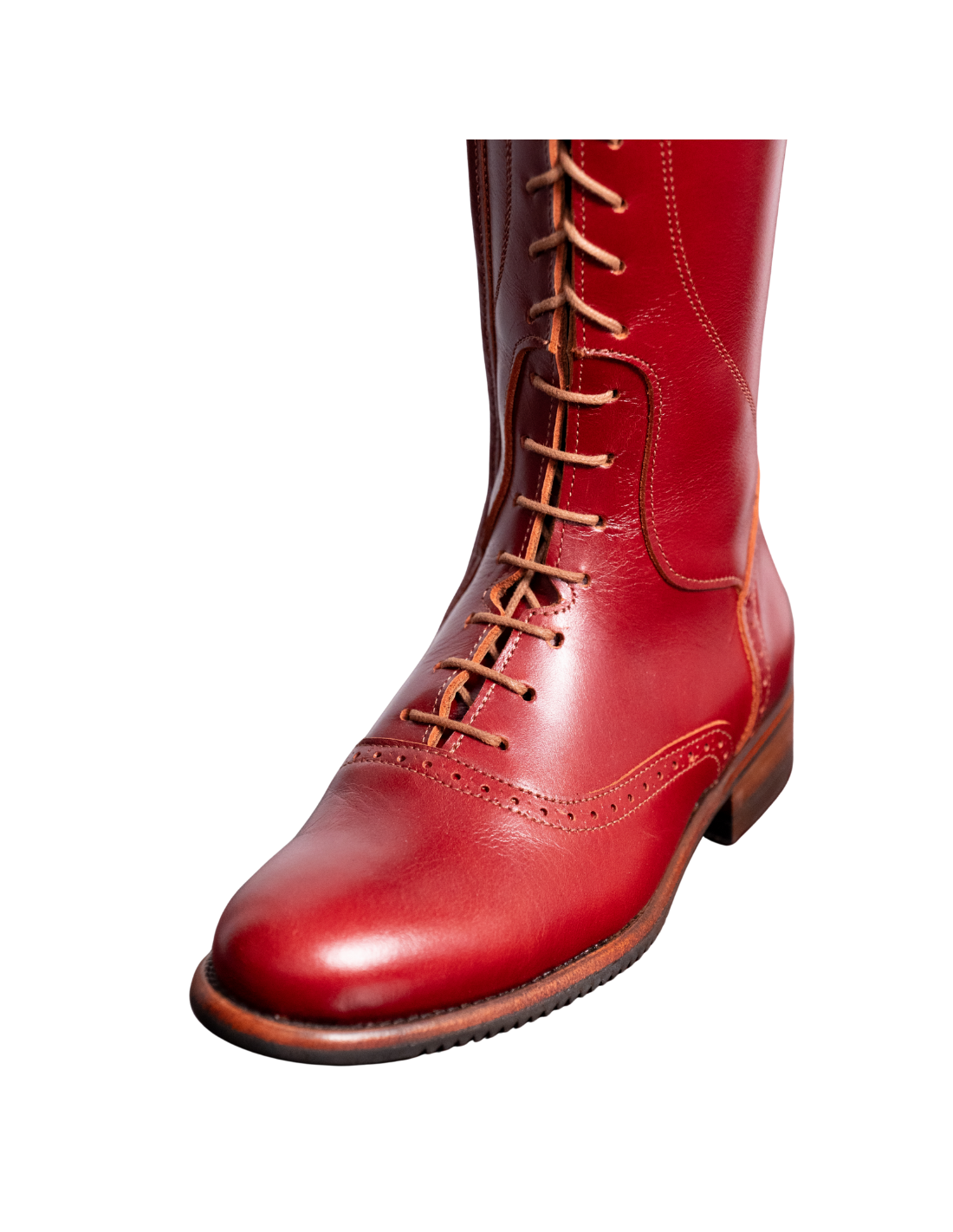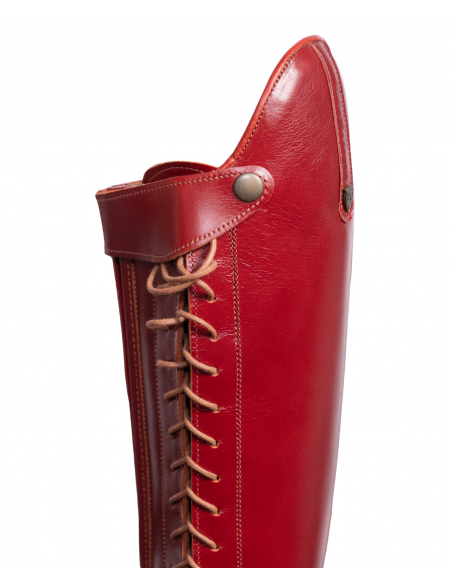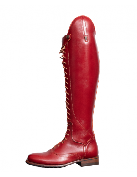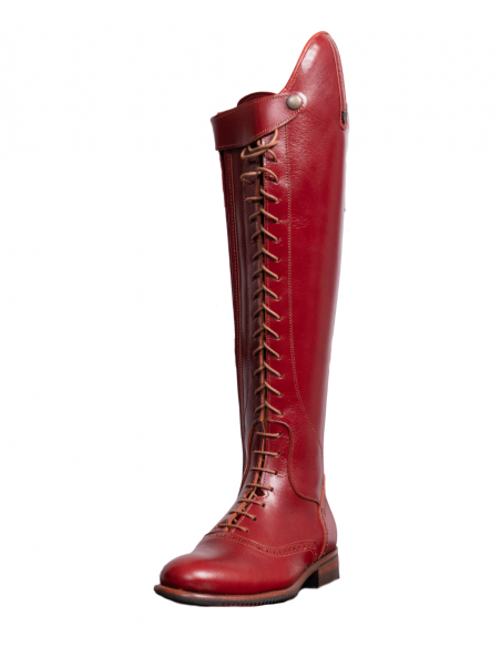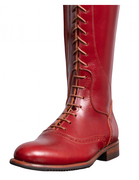 Bota de montar a caballo con cordones en color cereza. Tiene cremallera interior y suela vibram.