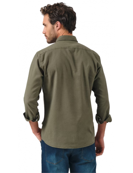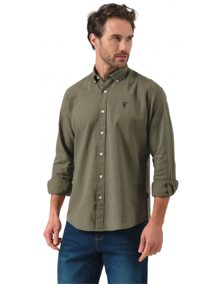 Camisa lisa de color caza confeccionada en tejido de lino y algodón. Corte semientallado, cuello clásico abotonado, cierre mediante botonadura frontal y manga larga terminada en puño abotonado. Detalle cosido en el extremo inferior de la botonera y en el lateral. Bordado en el pecho con el caballo.