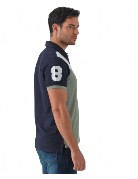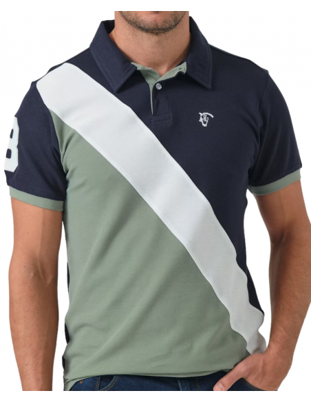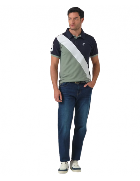 Polo clásico con banda frontal blanco, marino y verde confeccionado en tejido 100% algodón. Corte recto, cuello clásico, cierre mediante tapeta y manga corta terminada en puño al contraste. Bajo con aberturas laterales. Bordado en el pecho del logo de la marca y aplique de número conmemorativo en la manga derecha.
