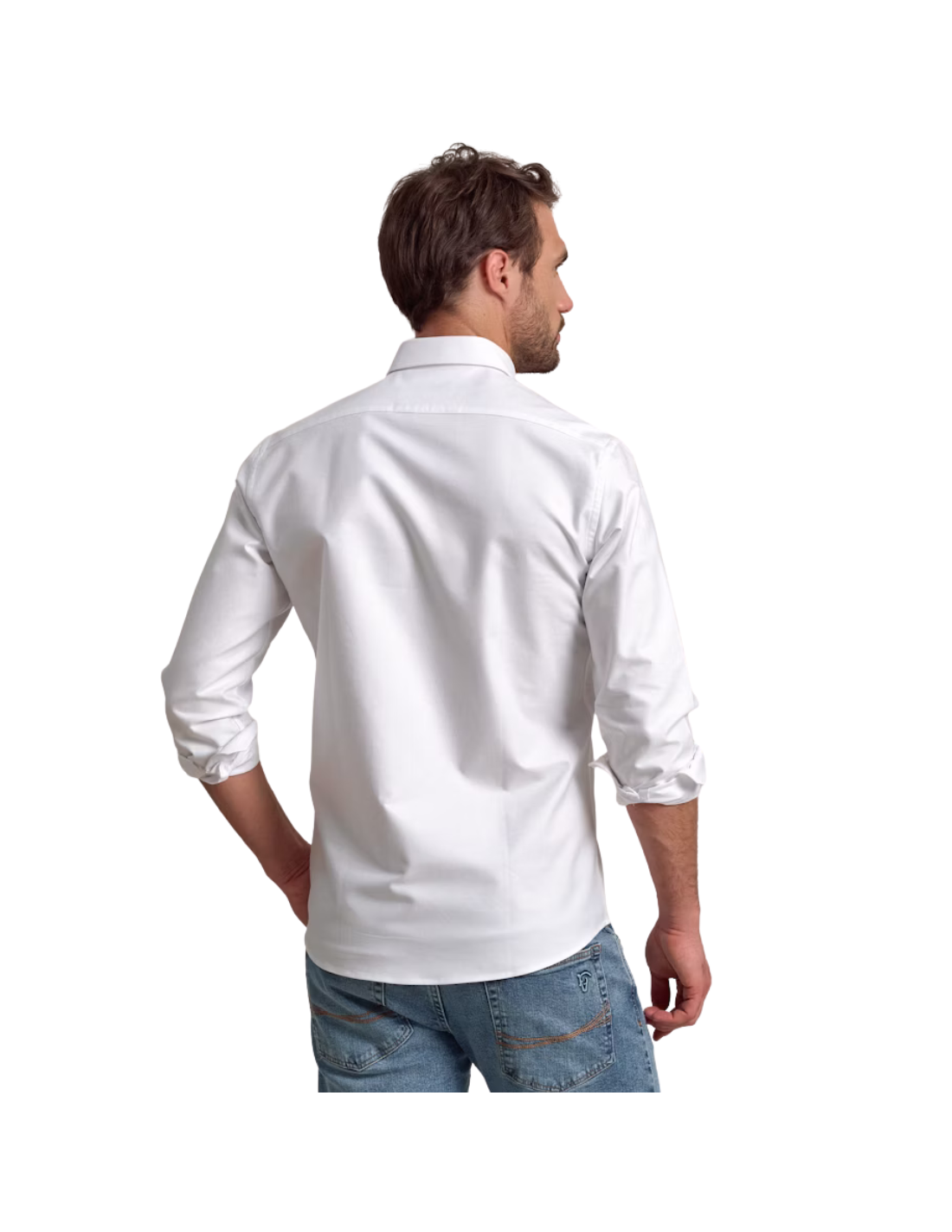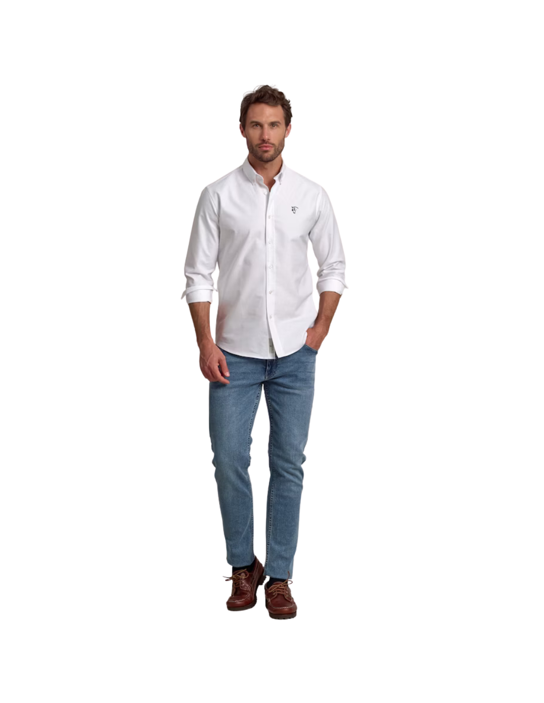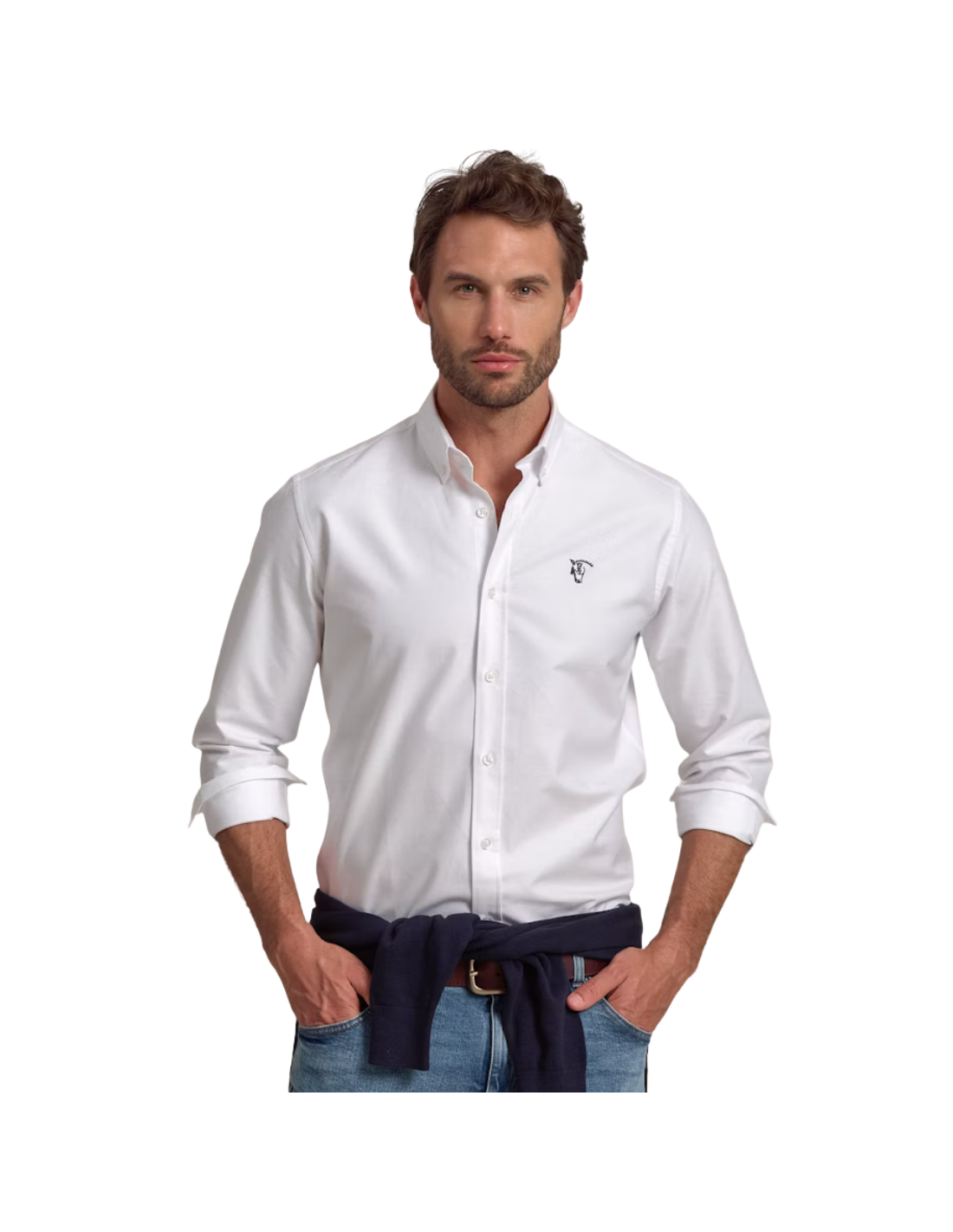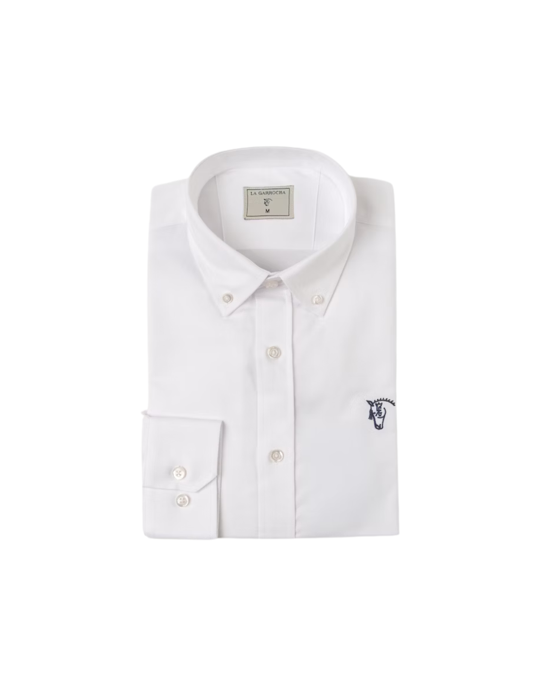 Camisa lisa de color blanco confeccionada en tejido 100% algodón. Corte semientallado, cuello clásico abotonado, cierre mediante botonadura frontal y manga larga terminada en puño abotonado. Etiqueta textil cosida en extremo inferior de la botonera y en el lateral. Bordado a contraste a la altura del pecho.