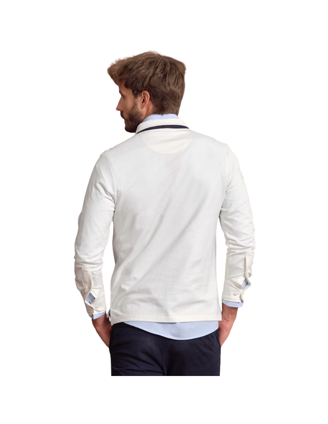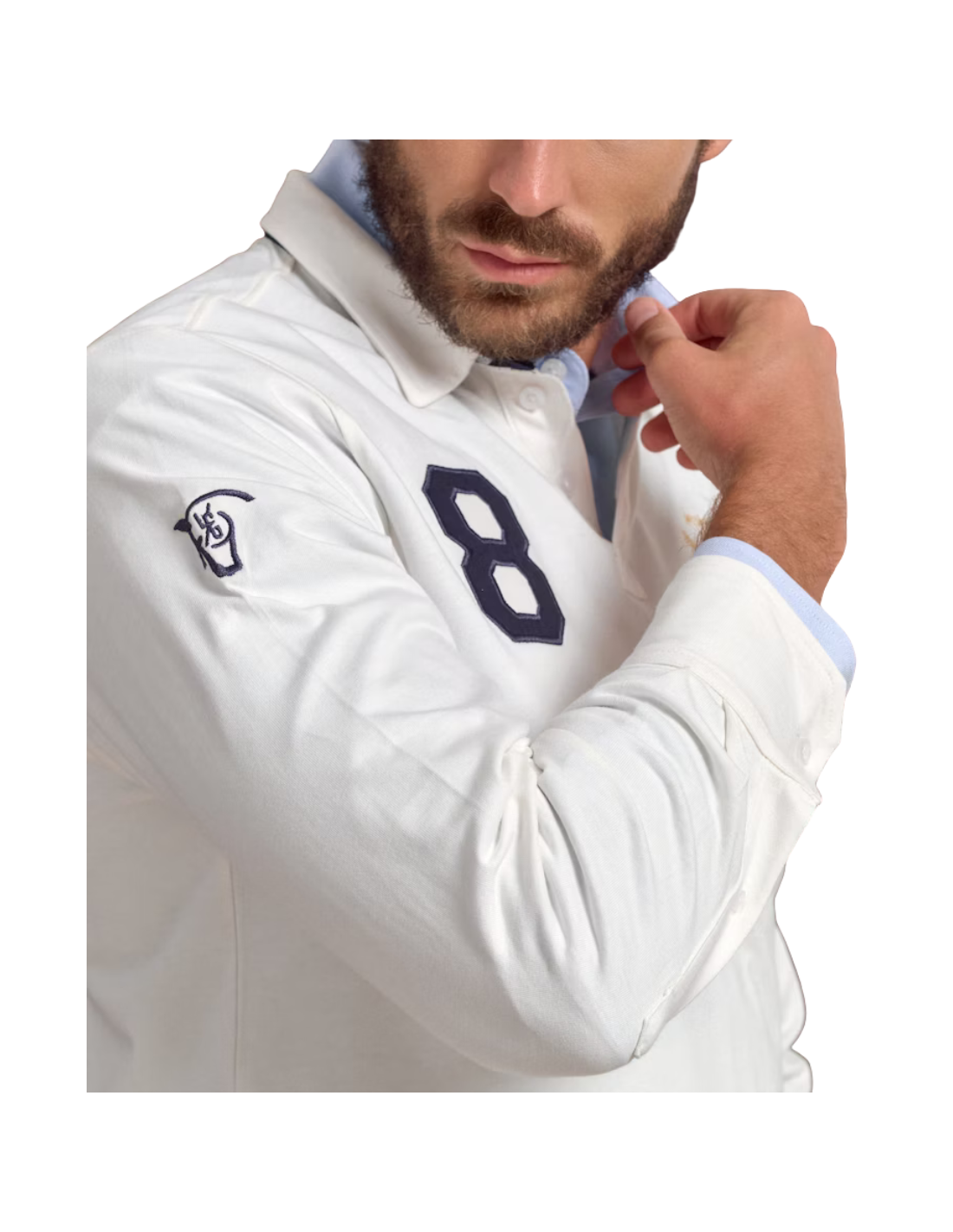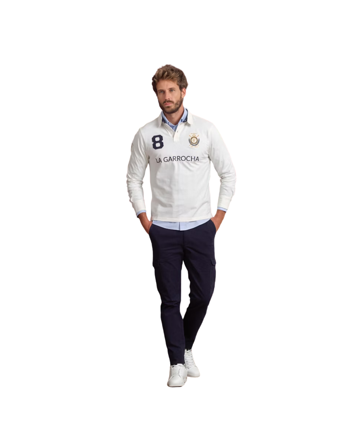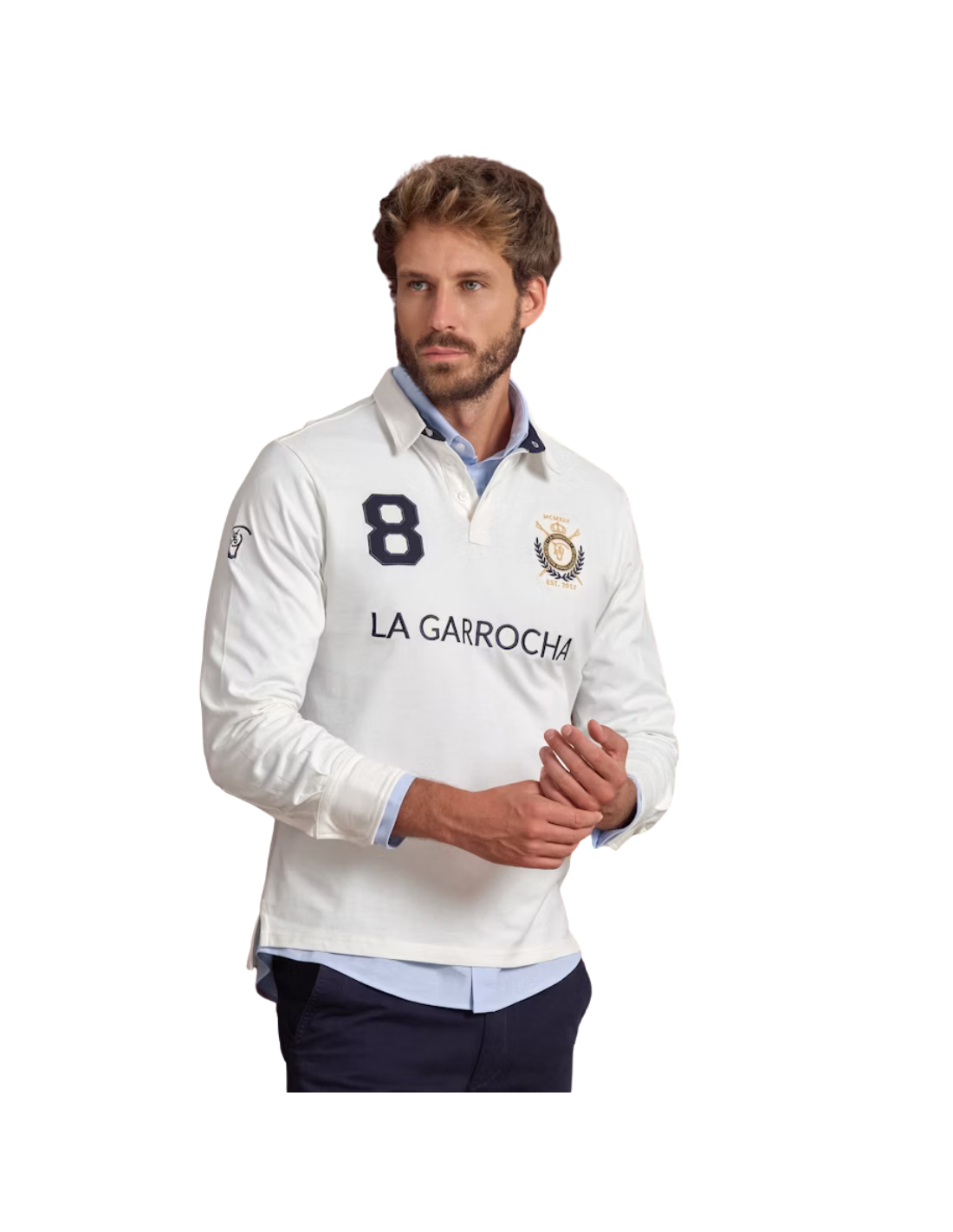 Polo liso de color crudo confeccionado en tejido 100% algodón. Corte recto, cuello clásico rematado al interior con media luna, cierre mediante tapeta y manga larga terminada en puño. Bajo con aberturas laterales. Parches bordados a contraste y elementos conmemorativos en el pecho y la manga derecha.