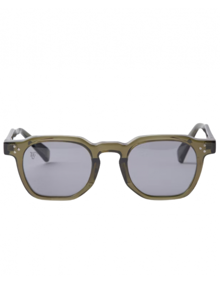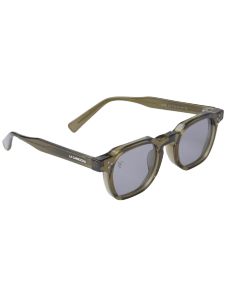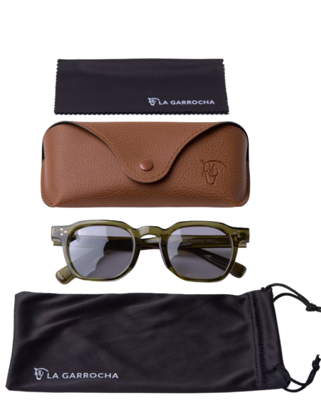 Gafas de sol de color caza con montura de carbono y lentes cuadradas. Patillas personalizadas con nuestra marca y cierre de bisagra. Lentes oscuras polarizadas con protección UV 400 Categoría 3. Incluye funda de microfibra, paño de limpieza y estuche grabado con el logo de la marca.