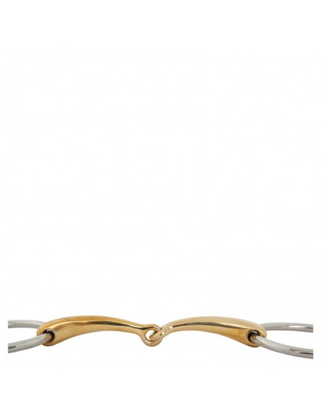 Este bocado de anillas sueltas de una sola pieza de alta calidad está hecho de cuprigan macizo con anillas de acero inoxidable. El cuprigan es una aleación que consta de un 89 % de cobre, un 7 % de aluminio, un 3 % de hierro y un 1 % de zinc. El proceso de oxidación del material le confiere un olor y un sabor agradables. El diseño anatómico del bocado sigue la forma de la boca del caballo, lo que permite una distribución suave y uniforme de la presión. El diseño, combinado con las propiedades únicas del cuprigan, fomenta el proceso de masticación y la producción de saliva, lo que permite una conexión agradable con la sensible boca del caballo. El bocado aplica una presión suave sobre la boca. Grosor de la embocadura: 12 mm, tamaño de las anillas: 70 mm. Un bocado de anillas sueltas permite que la embocadura se mueva libremente en relación con las anillas. Este tipo de bocado permite mucho movimiento, lo que lo convierte en uno de los bocados más aceptados.