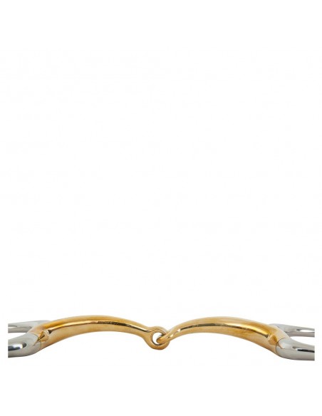 Este filete de doble articulación de alta calidad está fabricado en Cuprigan macizo con anillas de acero inoxidable. El diseño anatómico del bocado sigue la forma de la boca del caballo, lo que permite una distribución suave y uniforme de la presión. El diseño, combinado con las propiedades únicas del cuprigan, estimula el proceso de masticación y la producción de saliva, lo que permite una conexión agradable con la boca sensible del caballo. El bocado aplica una presión suave sobre la boca. Grosor de la embocadura: 12 mm, tamaño de los anillos: 55 mm. El bocado de una sola pieza tiene carrilleras fijas. Las ayudas tienen un efecto más directo y el bocado permite menos libertad de movimiento en comparación con el bocado de anillas sueltas, lo que lo hace más adecuado para caballos que tienden a jugar demasiado con el bocado.