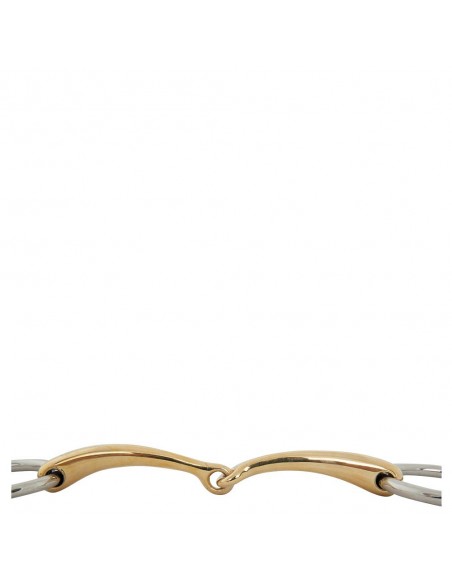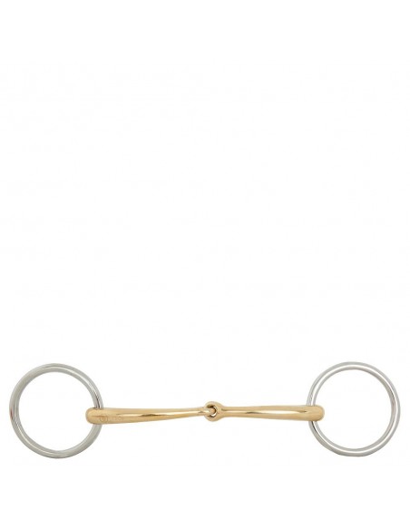 Bocado de anilla suelta de una sola pieza de alta calidad está hecho de cuprigan macizo con anillos de acero inoxidable. El diseño anatómico del bocado sigue la forma de la boca del caballo, lo que permite una distribución suave y uniforme de la presión. El diseño, combinado con las propiedades únicas del cuprigan, fomenta el proceso de masticación y la producción de saliva, lo que permite una conexión agradable con la boca sensible del caballo. El bocado aplica una presión normal sobre la boca.