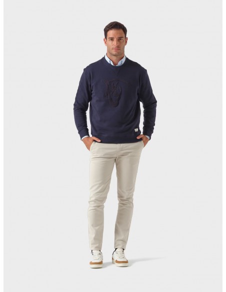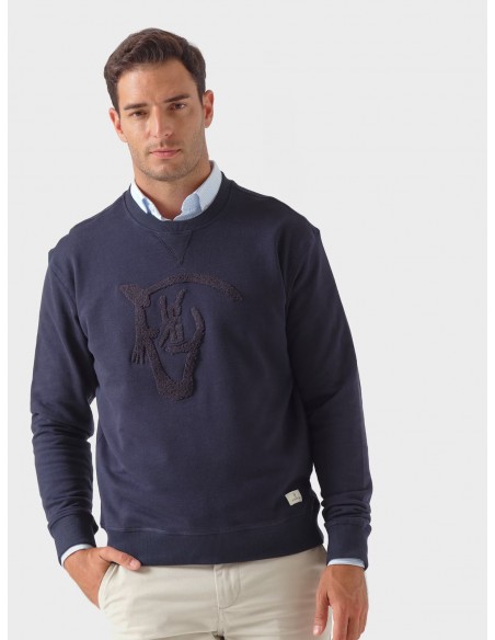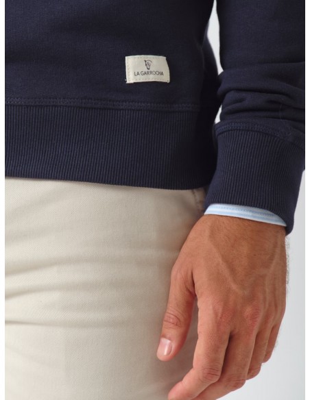 - Sudadera lisa en color azul marino confeccionada en tejido 100% algodón. Corte casual, cuello redondo, manga larga. Logo de nuestro caballo en tejido de toalla y etiqueta con nuestra marca en la parte inferior.