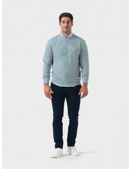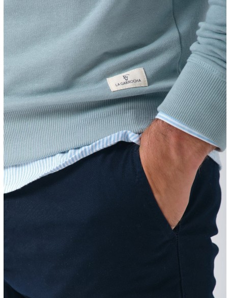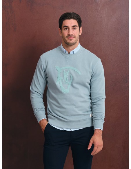 - Sudadera lisa en color azul zafiro confeccionada en tejido 100% algodón. Corte casual, cuello redondo, manga larga. Logo de nuestro caballo en tejido de toalla y etiqueta con nuestra marca en la parte inferior.