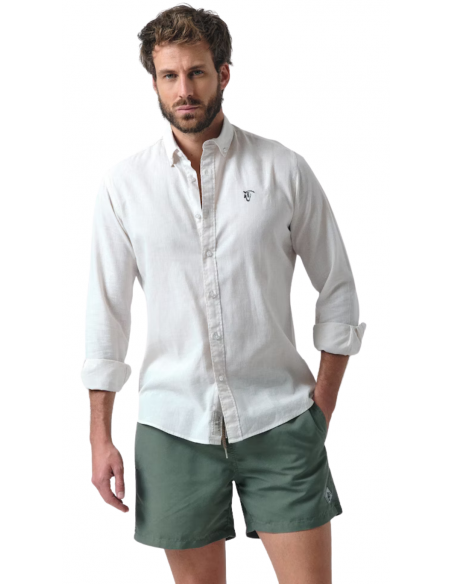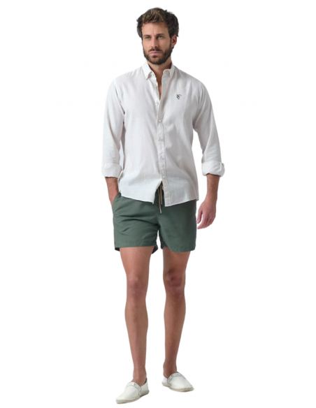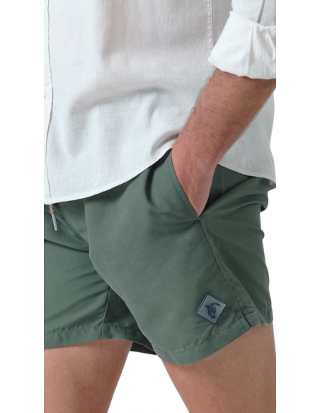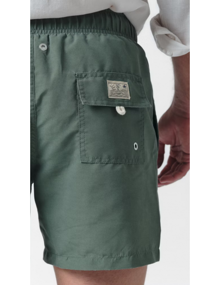 Bañador en color salvia confeccionado en tejido de poliéster con un acabado efecto lavado. Cintura elástica, cierre frontal mediante cordón. Dos bolsillos laterales y uno trasero con cierre de velcro. Parche engomado con el caballo en el bajo y etiqueta textil en el bolsillo trasero.