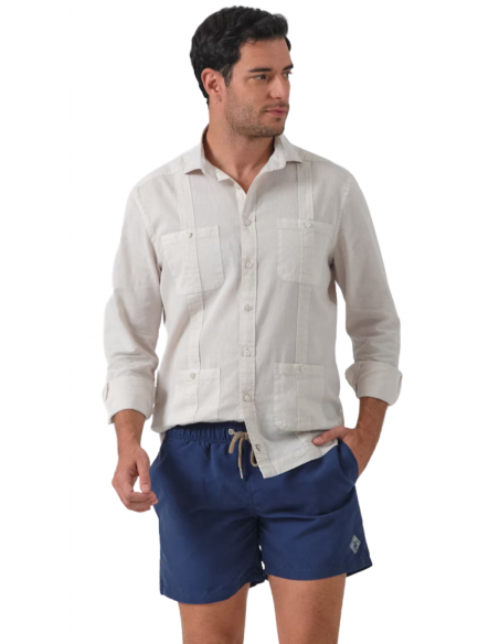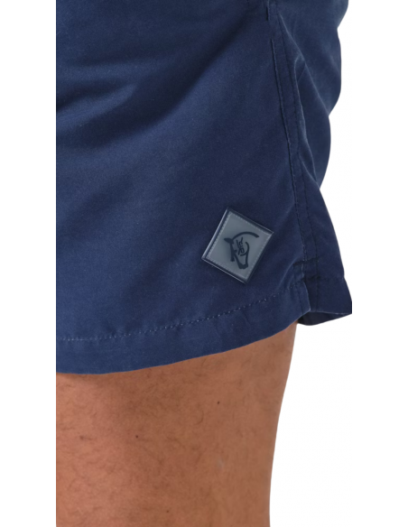 Bañador en color marino confeccionado en tejido de poliéster con un acabado efecto lavado. Cintura elástica, cierre frontal mediante cordón. Dos bolsillos laterales y uno trasero con cierre de velcro. Parche engomado con el caballo en el bajo y etiqueta textil en el bolsillo trasero.
