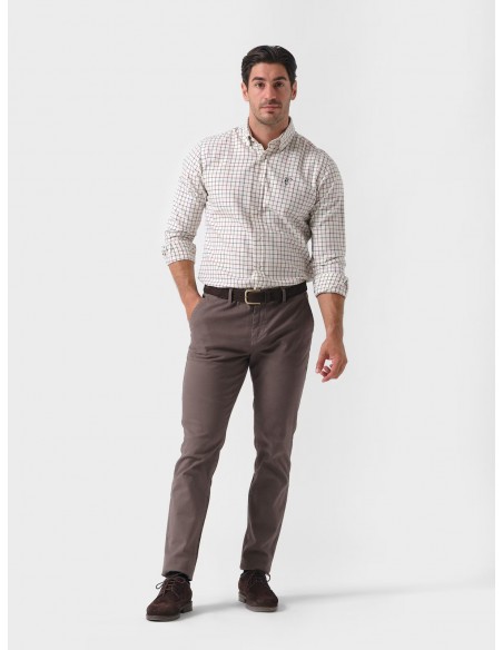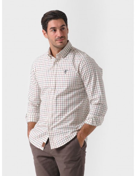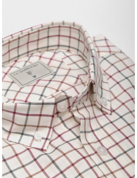 - Camisa con cuadros tattersall en tonos marino y marrón sobre fondo claro.