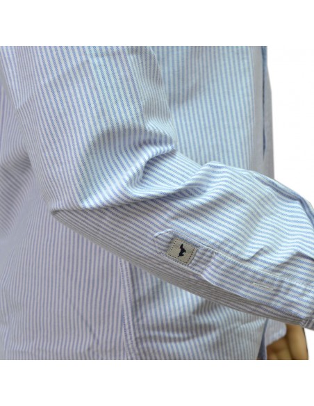 Corte semientallado, cuello clásico abotonado, cierre mediante botonadura frontal y manga larga terminada en puño abotonado. Detalle textil cosido en el lateral y en el extremo inferior de la botonera.