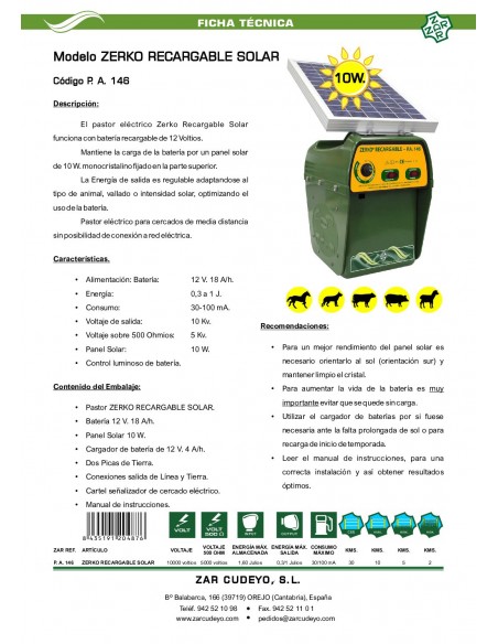 Compacto, moderno, dedicado a los propietarios de caballos y animales de compañía. Pastor entregado con Batería 12 V. 18 A ⁄ h. Para un mejor rendimiento del panel solar es necesario orientarlo al sol (orientación sur) y mantener limpio el cristal del panel. Se suministrara con un cargador Mod. Z-100 4 A /h. por si fuese necesario por la falta prolongada de sol.
