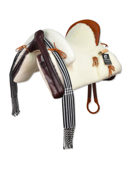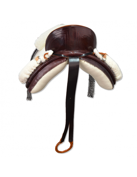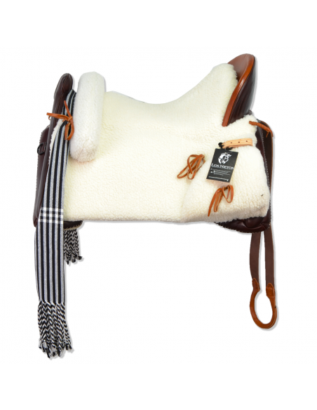 Silla vaquera mixta de fabricación española, modelo Initium en color chocolate. Tamaño estándar con zalea de borrego sintético.