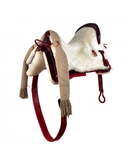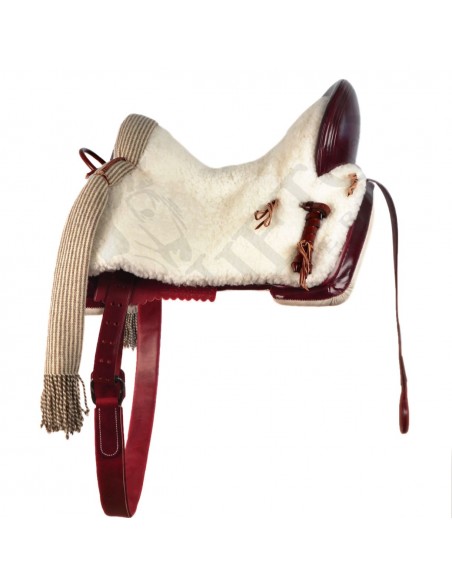 • Con sistema de cinchado ancho para una mayor sujeción del jinete al caballo y un asa de acero forrado de cuero anclado en la perilla
