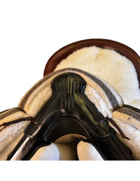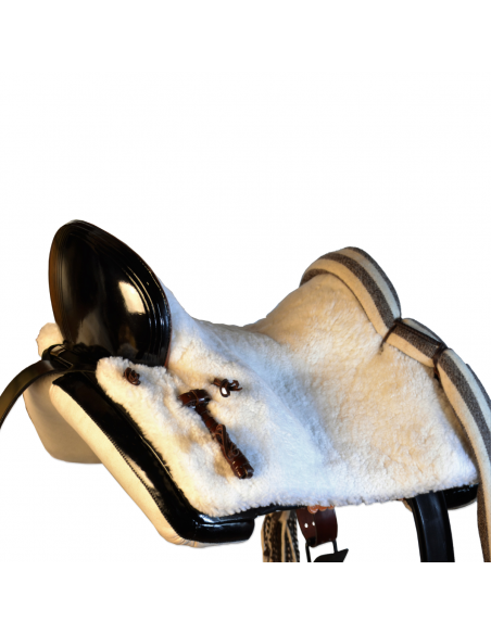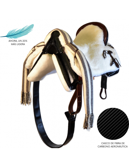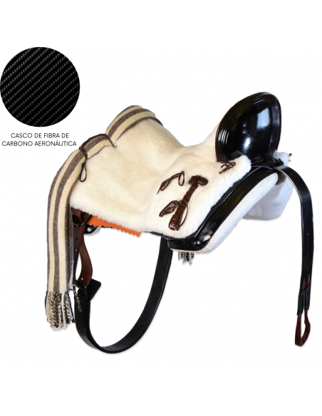 Montura vaquera artesanal con armazón en fibra de carbono aeronáutica que reduce el peso en un 20%. Consta de asiento profundo para un mejor contacto con el caballo y comodidad. Concha abalonada y una perilla retrasada para mejorar la salida de la mano del jinete. Esta montura se realiza de forma personalizada por lo que si tiene alguna consulta llámenos al 626905889, le atenderemos personalmente y resolveremos cualquier duda.
